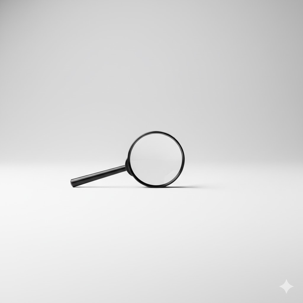Fotografia concettuale, minimalista e simbolica. Una singola piccola lente d'ingrandimento, in stile classico con montatura sottile, posta delicatamente su una superficie bianca o grigio chiaro. La lente è puntata verso uno spazio vuoto, suggerendo un'attenzione e un'osservazione focalizzata, senza elementi visivi distraenti. Ampio spazio negativo intorno alla lente. Palette di colori limitata a toni neutri (bianco, grigio, nero lucido della montatura). Sfondo uniforme e pulito. Messa a fuoco nitida sulla lente. Formato quadrato